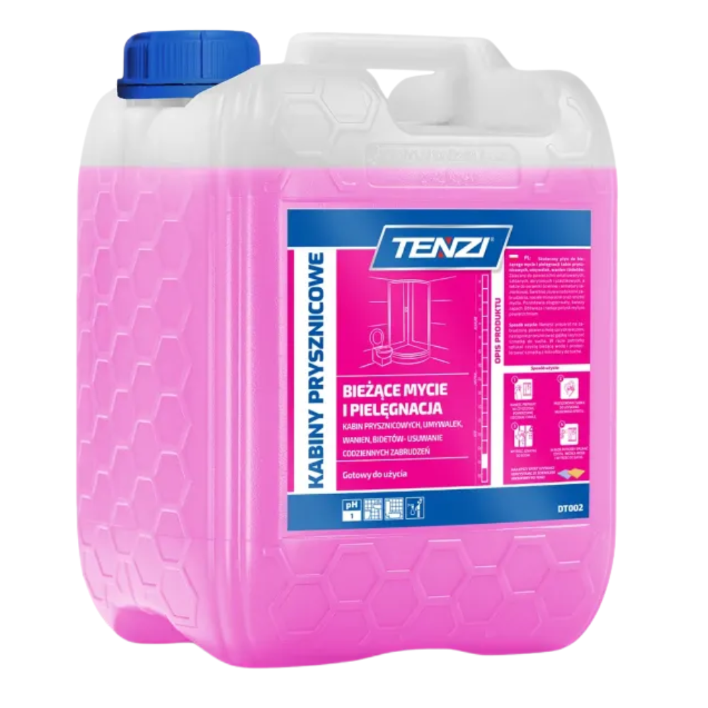Kabiny prysznicowe 5L – płyn do mycia i pielęgnacji kabin łazienkowych Tenzi to efektywny i bezpieczny preparat do codziennego utrzymania czystości w łazience. Produkt jest gotowy do użycia i został stworzony z myślą o codziennym usuwaniu zabrudzeń typowych dla kabin prysznicowych i urządzeń sanitarnych: brudu, nacieków mineralnych, kamienia, osadów mydlanych oraz innych nieestetycznych śladów.